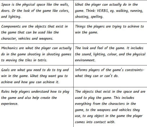 For this activity, I followed the instructions and researched what the elements in game design are. It was hard to write down the definitions in a good amount of detail. I enjoyed learning about game design, doing this activity I learned about what the design elements are.